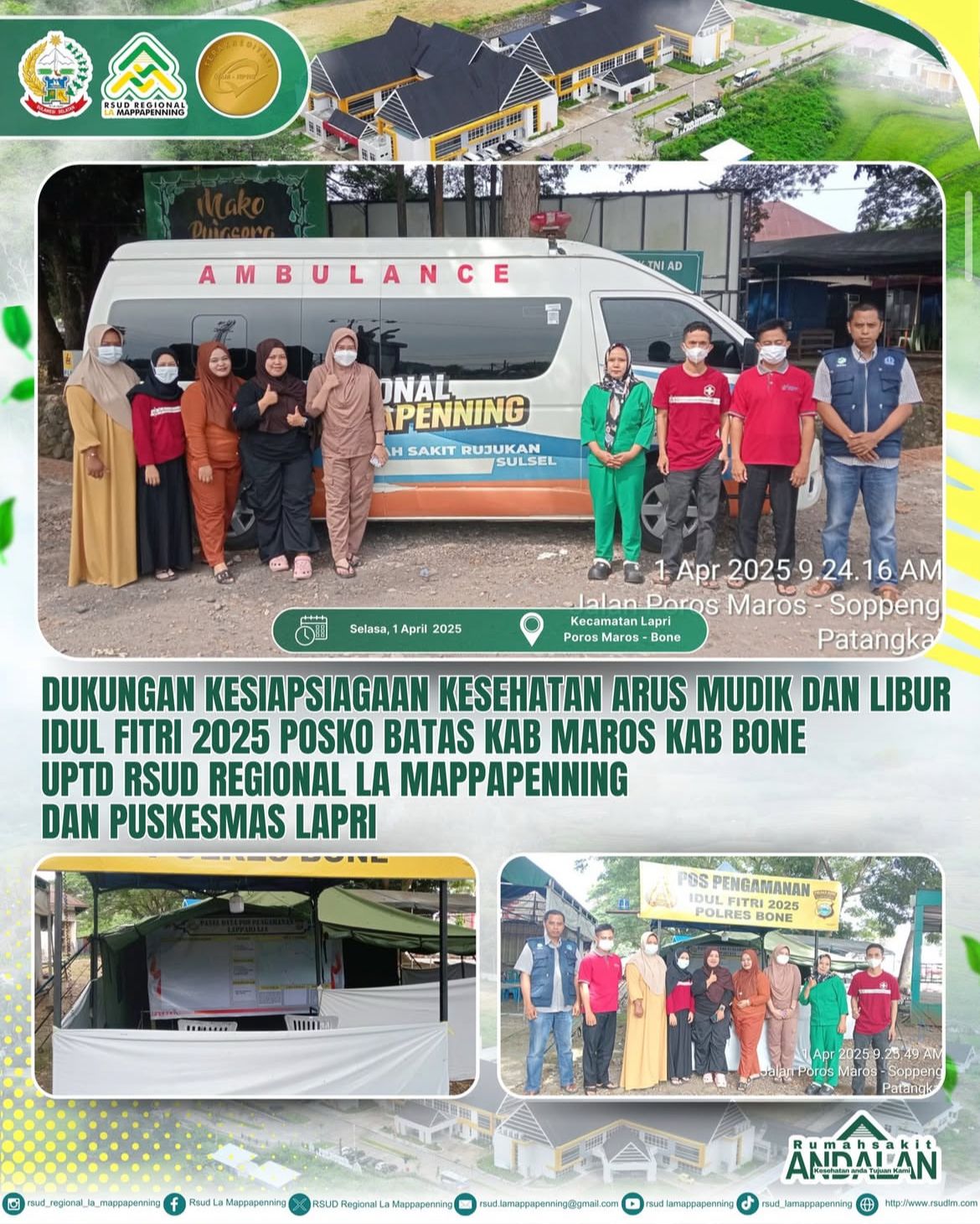 Hari Kedelapan RSUD Regional La Mappapenning bersama Puskesmas Lapri siap siaga di Posko Kesehatan Batas Kab. Maros – Kab. Bone untuk mendukung kesehatan pemudik. Rabu, 2 April 2025